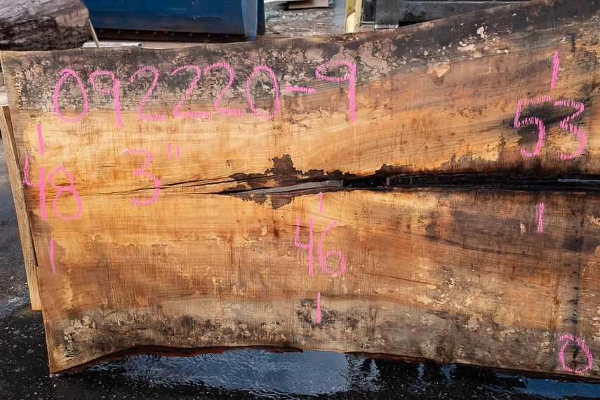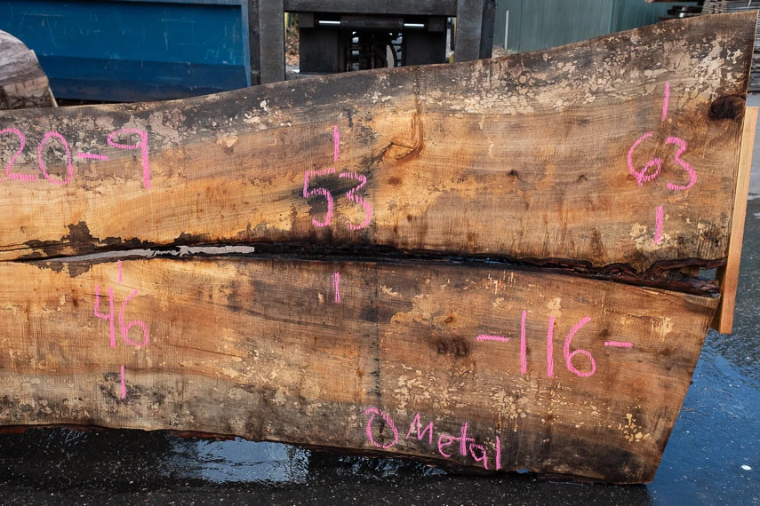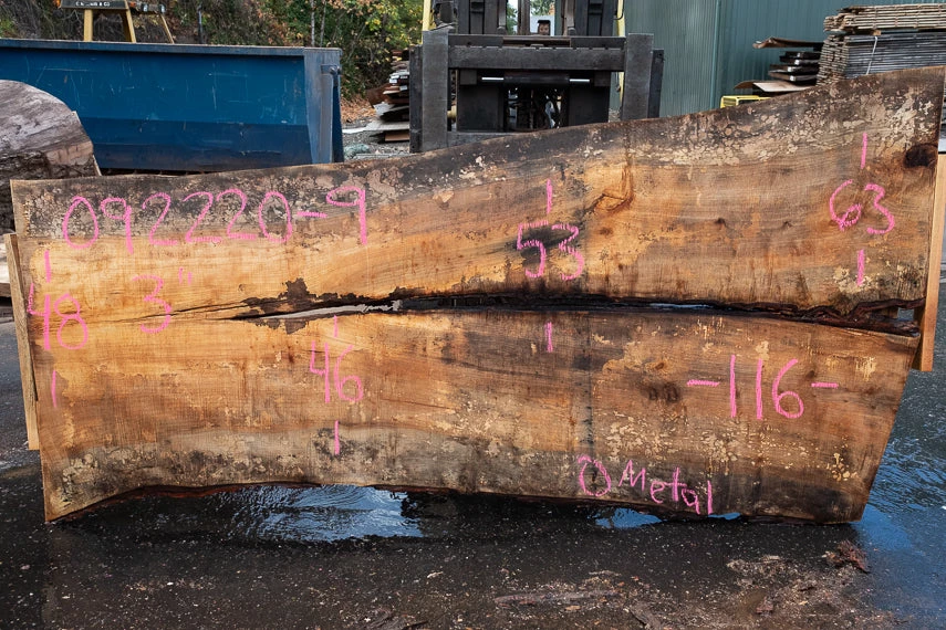 Soft knot top right, Small bark inclusion top right, Metal, Crack and bark inclusion through center – stabilized, Slight blade wandering