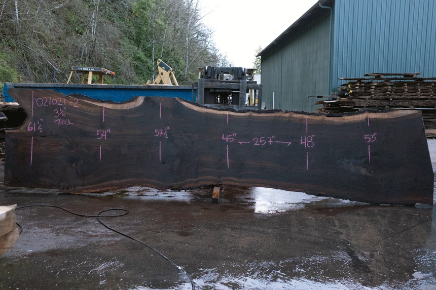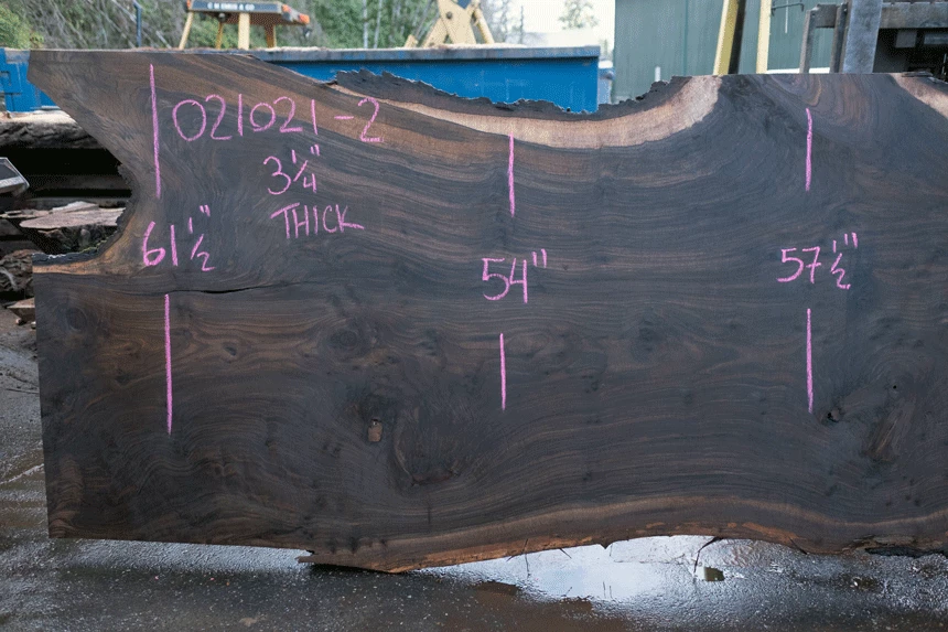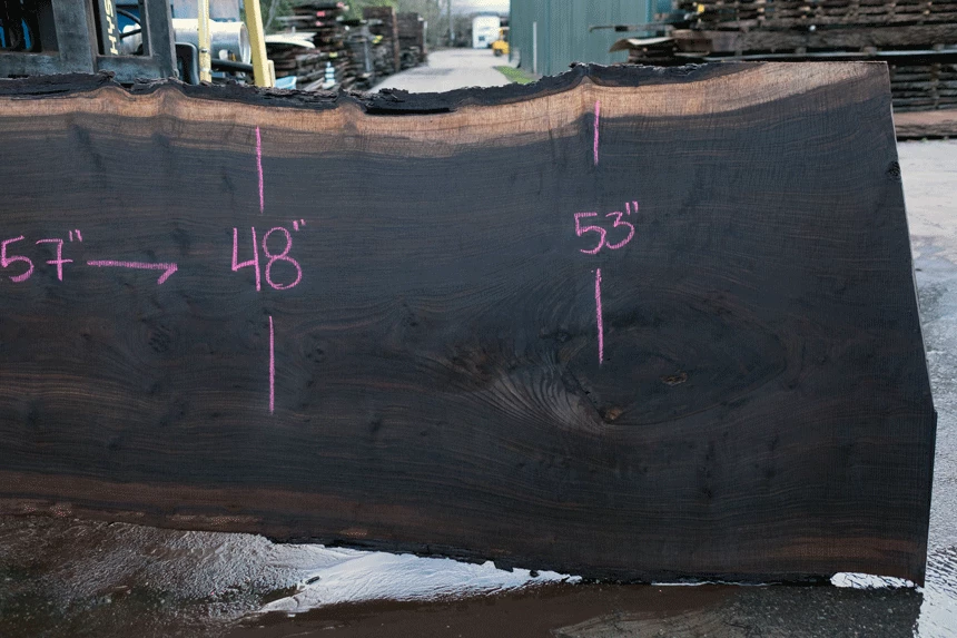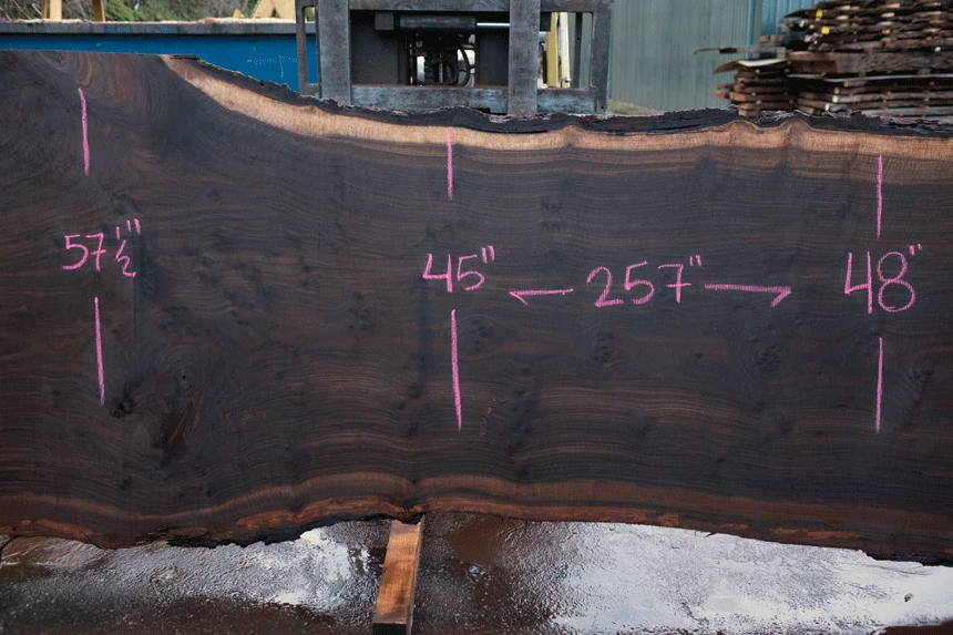 Crack in crotch, Small open knot bottom left, Open knot center and right side, Figured