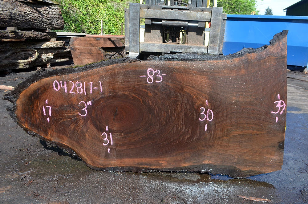 Cracked knot in center, Radial compression figure, Small bark inclusion bottom right