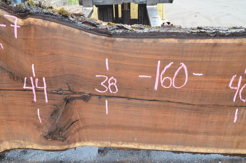 Crack through center, Partially rotten bark inclusion bottom center, Metal stain right end