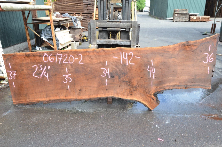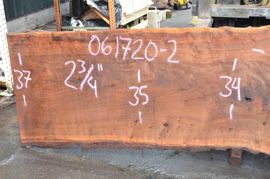 Small crack far left and top edge, Small sound knots, Small bark inclusions, Soft knots right, Light figure