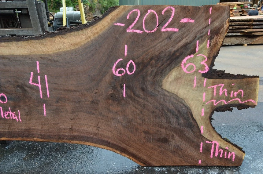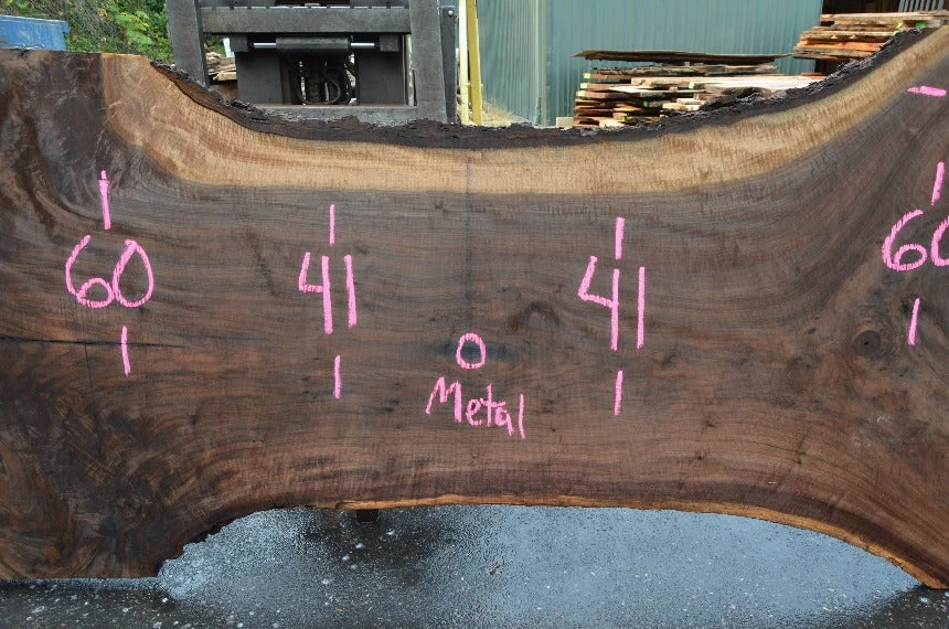 Rotted bark inclusion left end, Crack through center, Metal center, Rot along edge far right, Blade wandering
