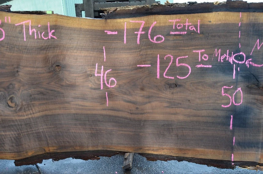 Cracked left end, Bark inclusions, Cracked knot left, Nail marked, Blade wandering right of nail, Rot spot right