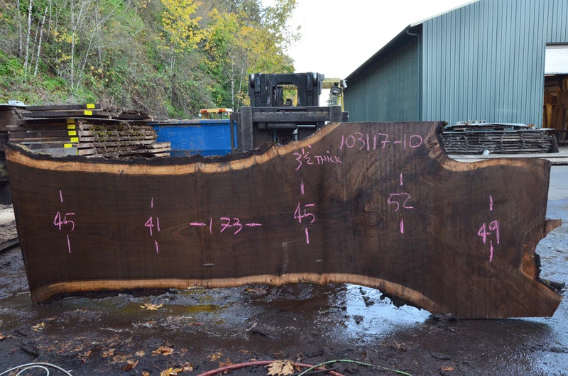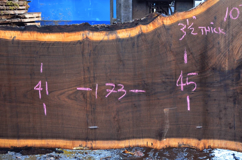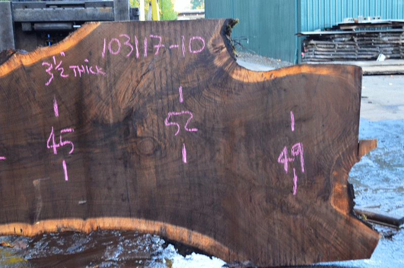 Nice figure throughout slab, Soft knot top right with surface check, Large sound knot right center, Two feather crotches