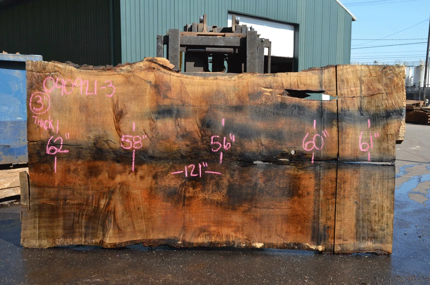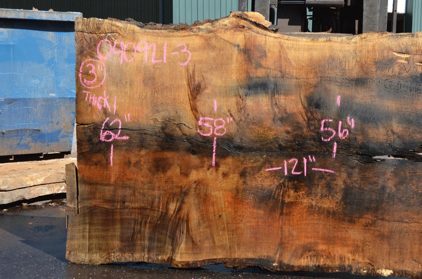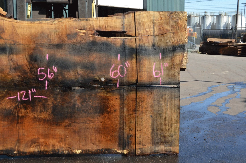 Wind checked cracks throughout slab, Top left cracked bark inclusion, Upper right open bark inclusion