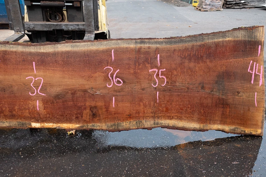 Sound knots, Small bark inclusion bottom left, Small bullet bottom right, Small cracks along center, Light figure