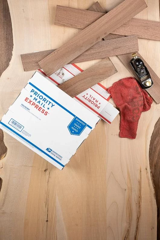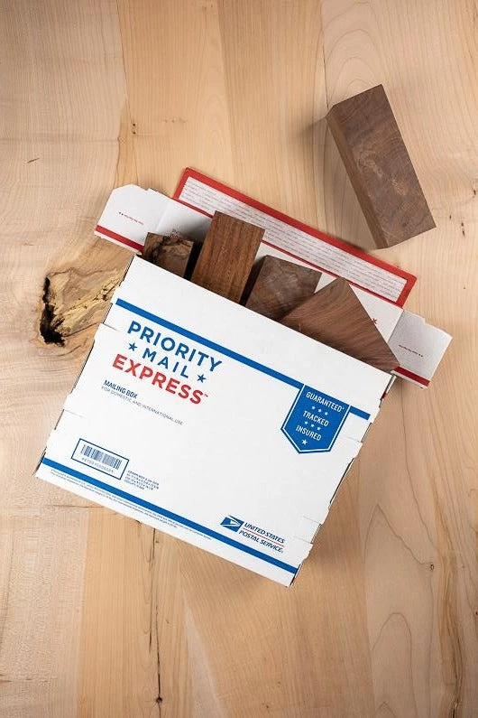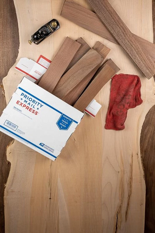 Pack of Oregon Black Walnut shorts, 1″ to 1.25″ thick. Surfaced one face. 2 to 6 pieces per 14″ x 12″ x 3.5″ box.